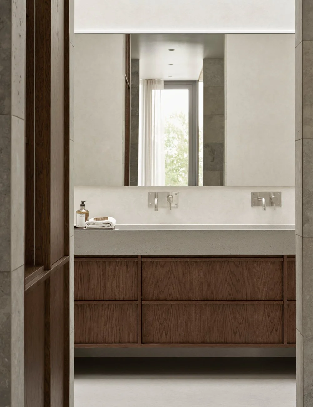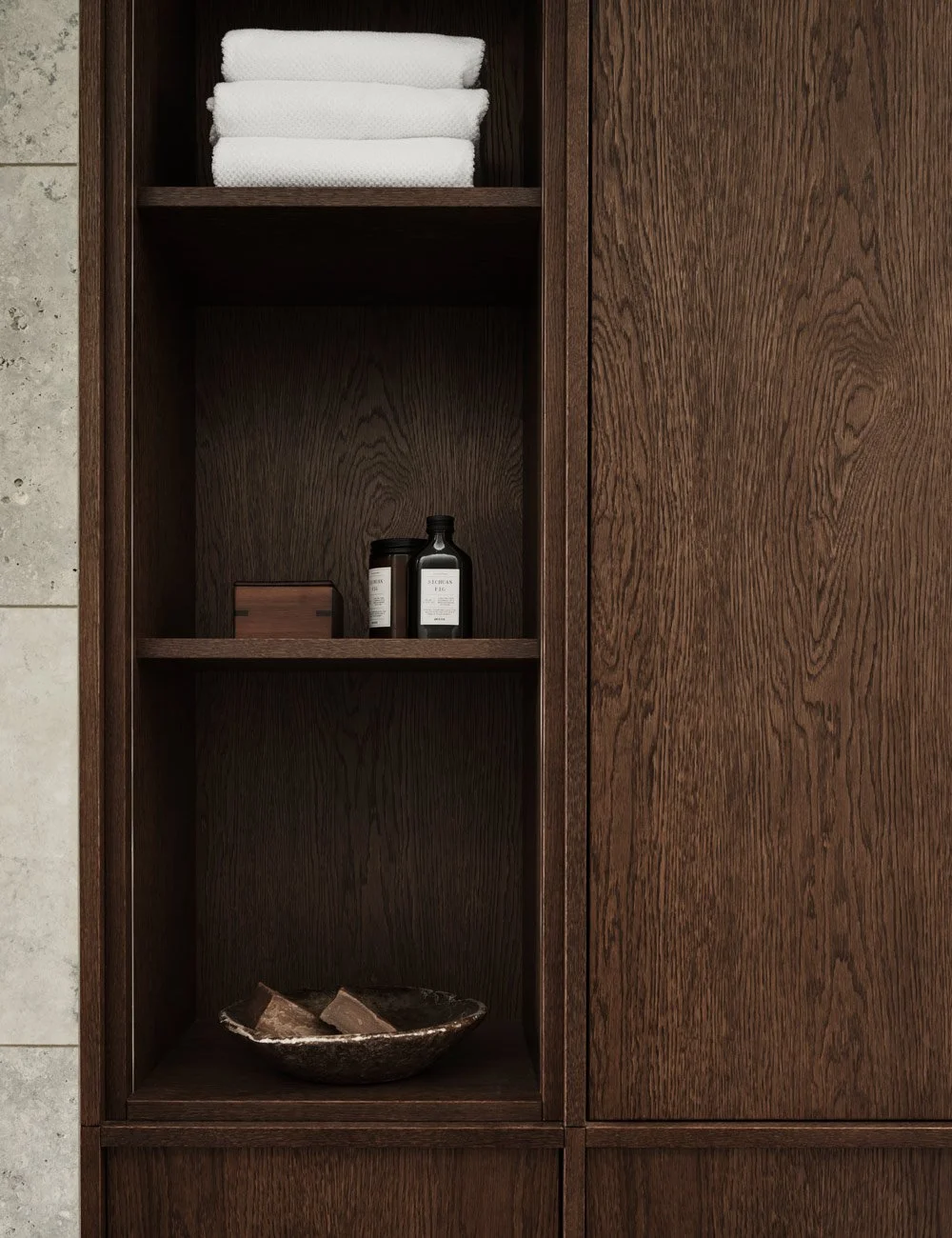 Tilpasset baderomsinnredning samt innebygd hylle i mørkbeiset eik for å skape et enhetlig design på badet.