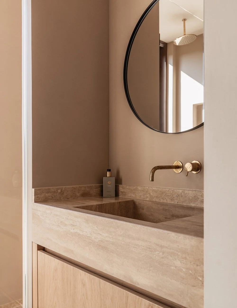 Baderomskommode med slette fronter og skjult gripelist. Servant i Ölands-kalkstein.