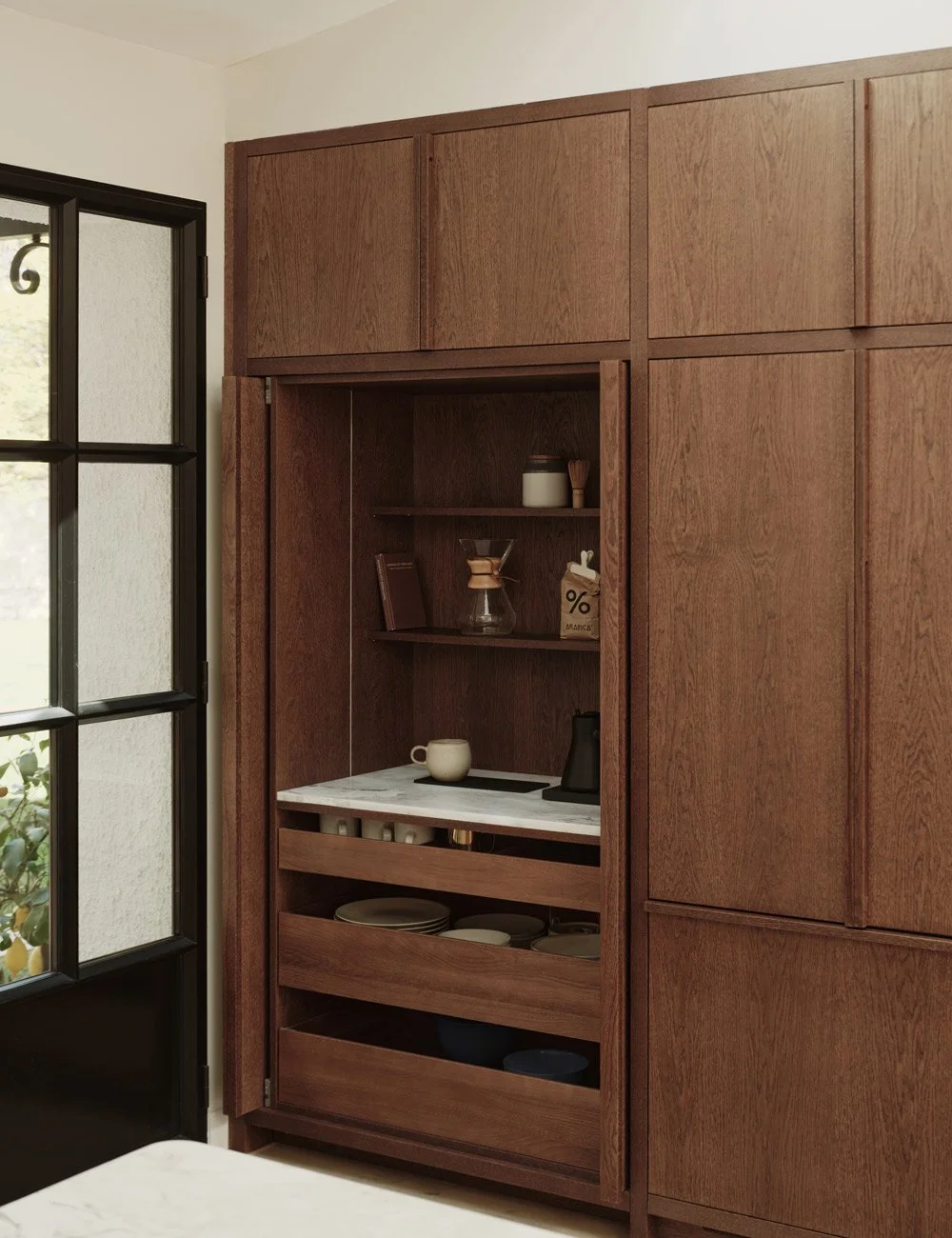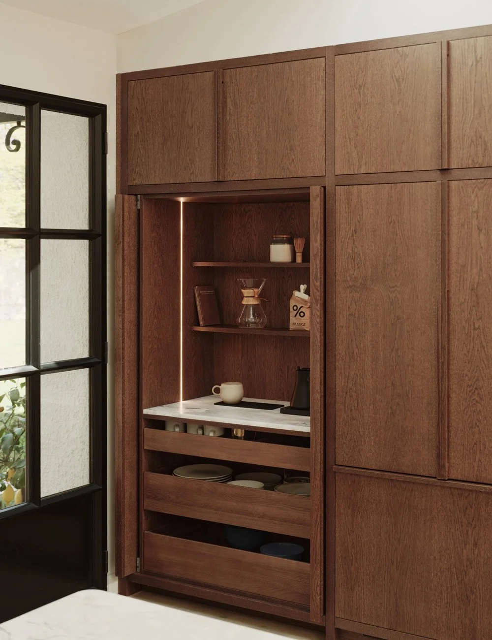 I ett av de plassbygde høyskapene finnes et "pocket door"-skap med skyvedører som skjuler både kaffe-/tehjørne og smart oppbevaring.