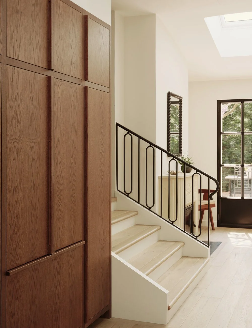 Innebygde høyskap i mørk eik strekker seg fra gulv til tak og tilbyr rikelig med oppbevaringsplass, samtidig som de forsterker følelsen av romslighet.