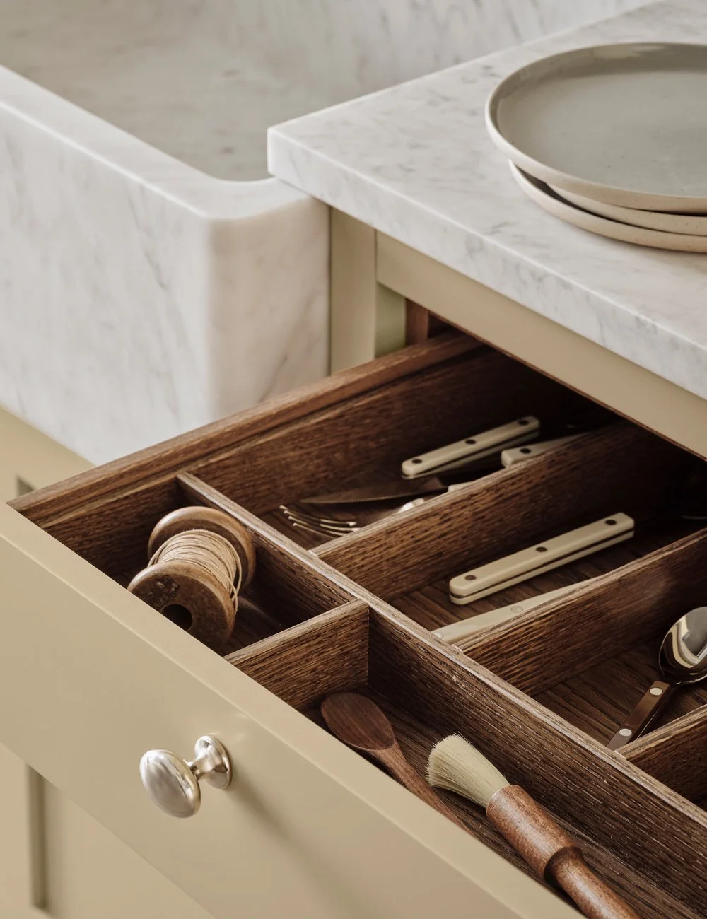 Skuffer i massiv eik og spesialtilpassede bestikkinnsatser gir en vakker kontrast mot de lyst gule frontene.