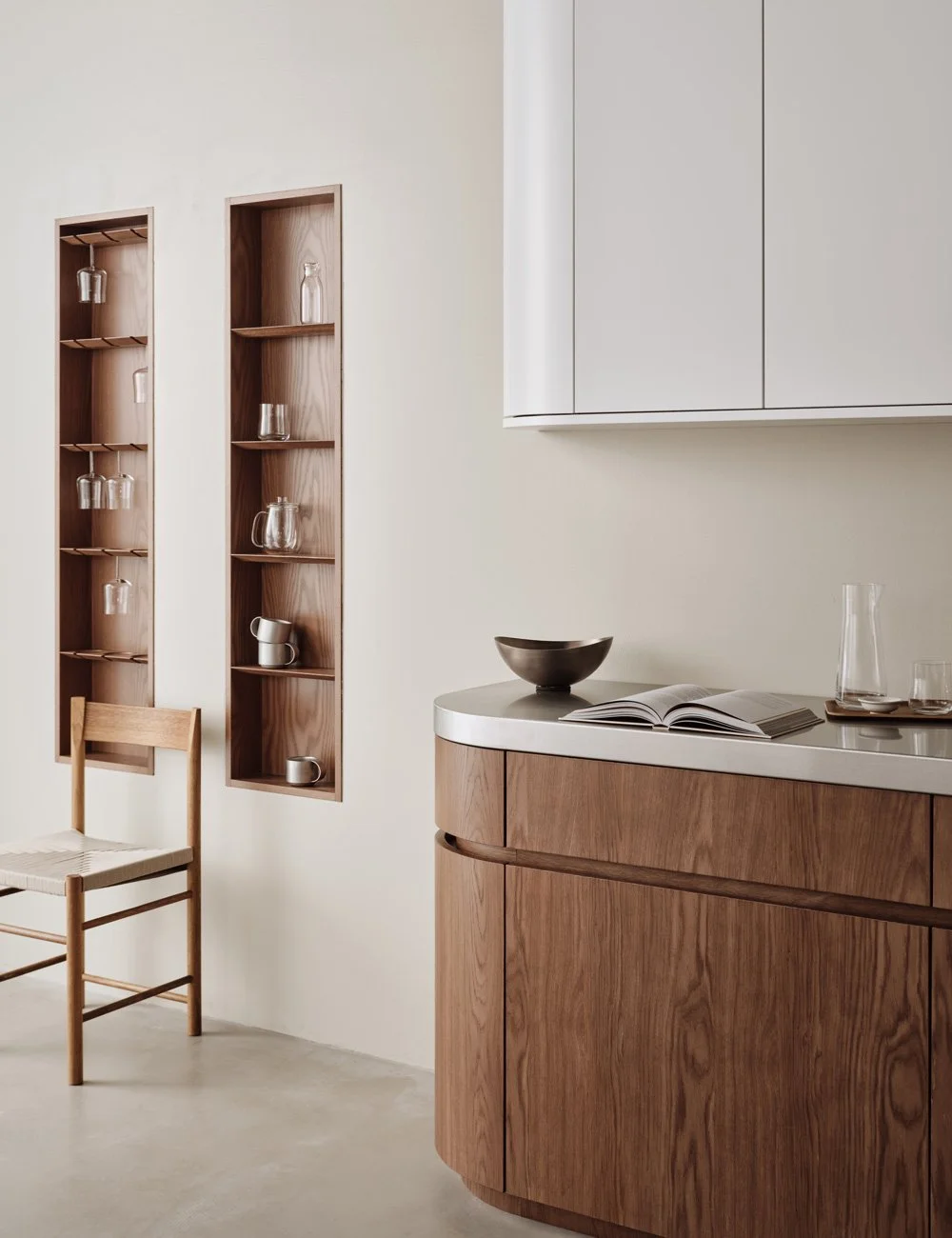 Med avrundede former og en sømløs følelse kombineres rustfritt stål og tre for å skape et stilrent og nedtonet kjøkkendesign.