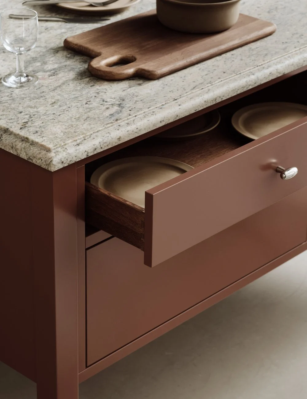 Kjøkkenøy i fargen Deep Blush, med treskuffer i massiv eik og benkeplate i granitt Lemon Ice.