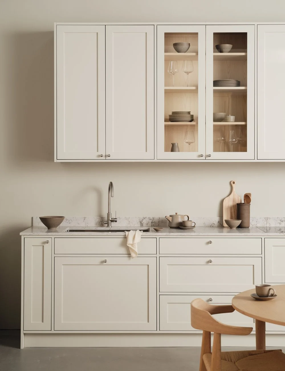 Klassisk shakerkjøkken i fargen Light Pearl med elegant vitrineskap.