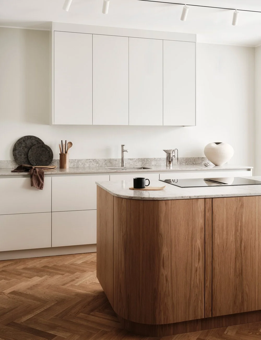 Tidløs kjøkkenøy i eik med avrundede grepplister og benkeplate i marmor Noisette.