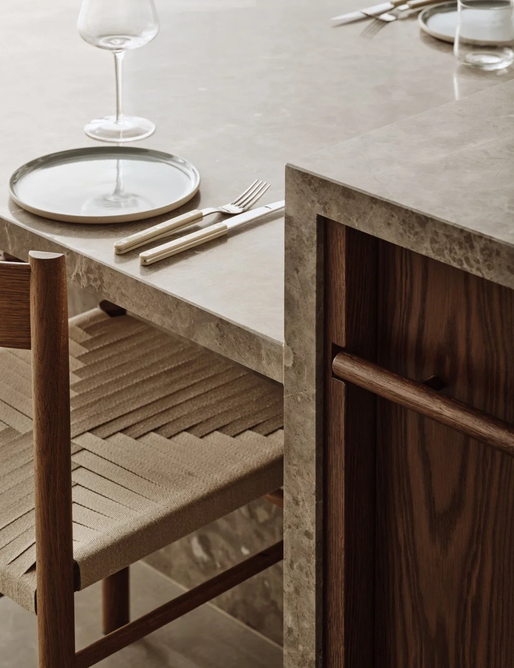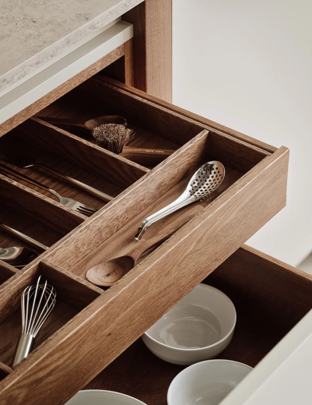 Treskuffer i massiv eik med spesialtilpassede bestikkinnsatser forsterker håndverksfølelsen i kjøkkenet.