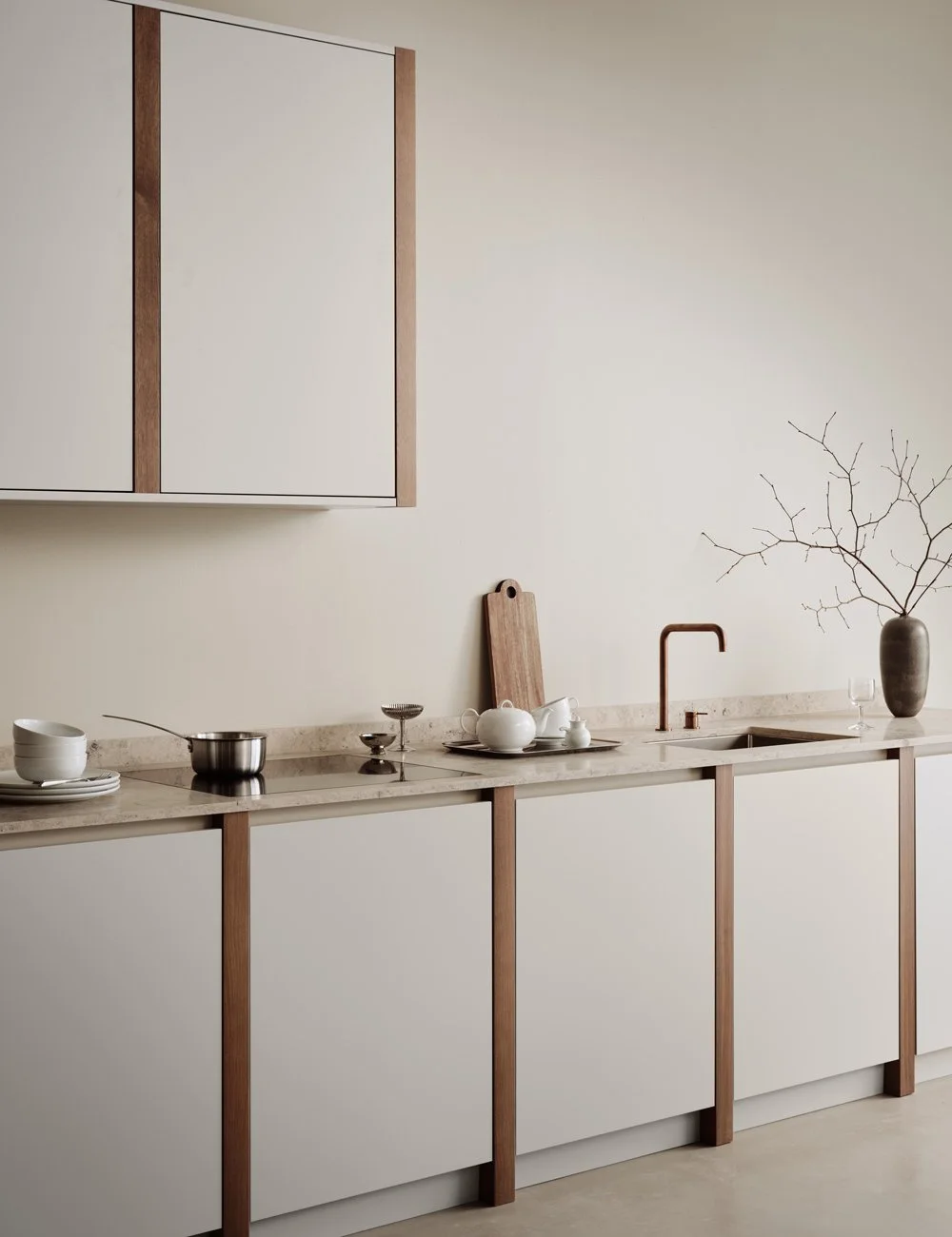 Minimalistisk kjøkken med glatte fronter og dekorative eikedetaljer samt benkeplate i Jura Grey kalkstein. Frontene er malt i fargen Soft Linen.