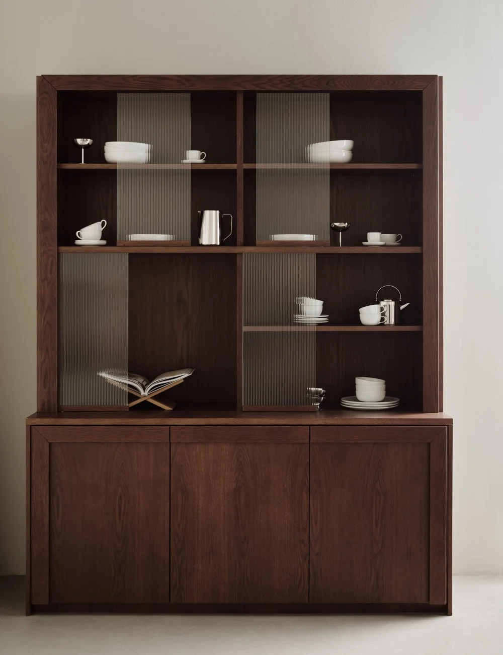 Vitrineskap i eik i en vakker rødbrun nyanse, med elegant linjeglass.