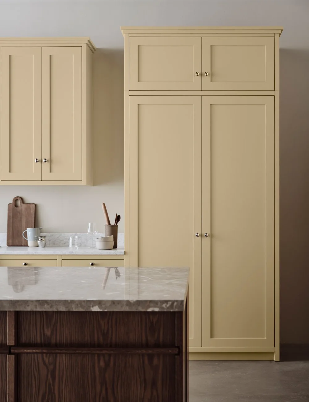 Rustikt shakerkjøkken i gult med elegante detaljer i mørk eik og Carrara-marmor.