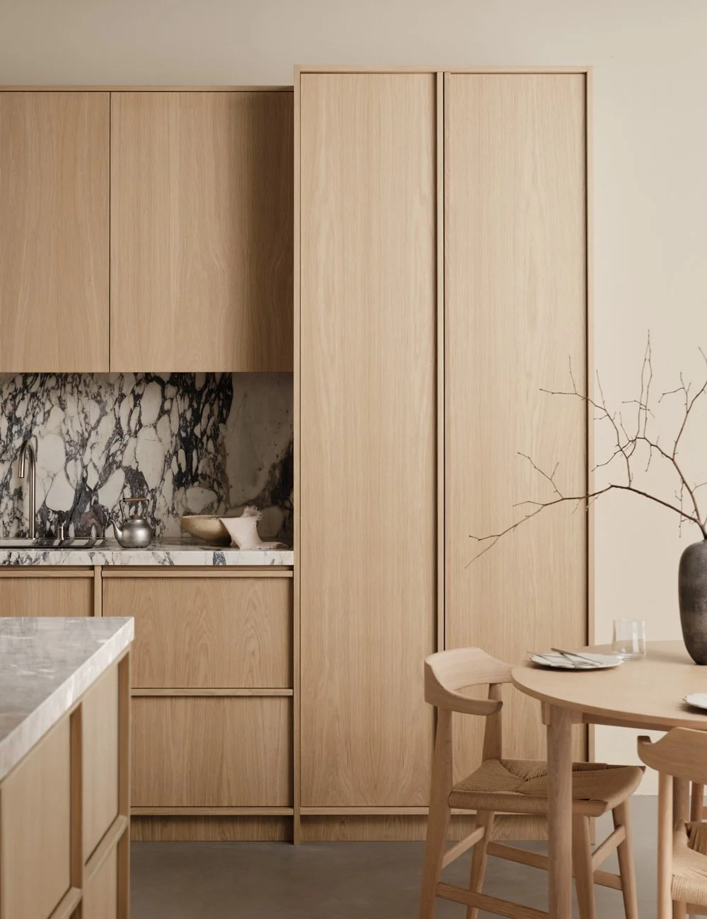 Lyst eikekjøkken med marmor og naturlige materialer, der rene linjer skaper en perfekt balanse mellom rustikk sjarm og skandinavisk design.