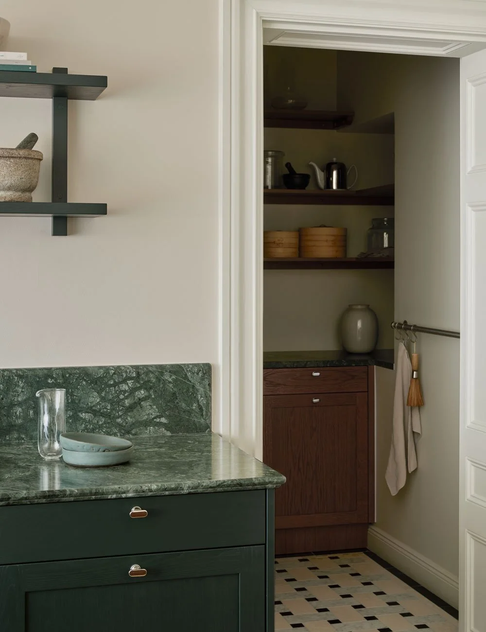 Ved siden av kjøkkenet ligger et lite pantry med skapdører i samme mørke eik som kjøkkenøya.