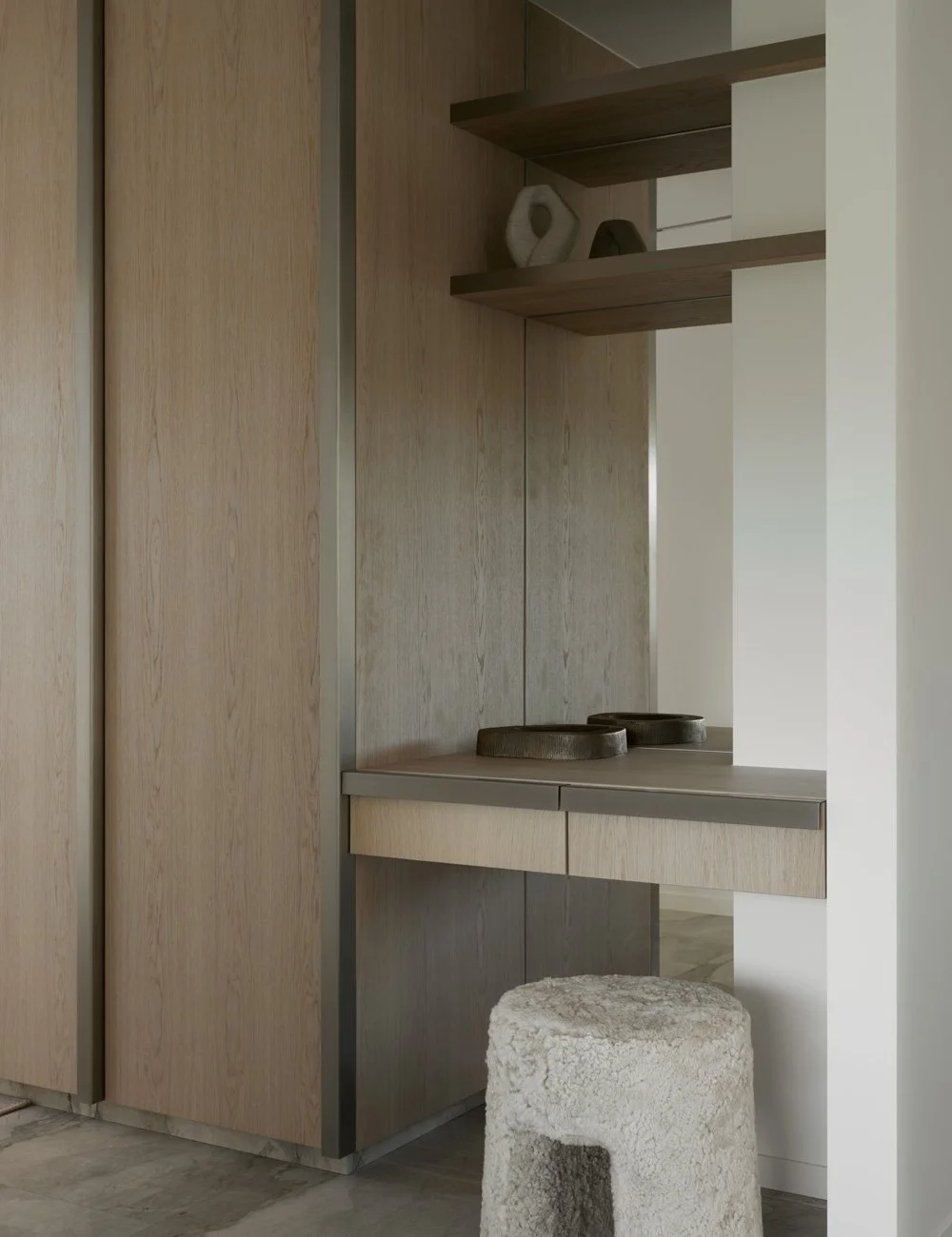 De lyse eikdetaljene, elementene i børstet stål og steinoverflatene i White Camouflage danner en gjentakende rytme, der hver flate spiller sammen heller enn å konkurrere. Ved å arbeide med nyanser og teksturer i stedet for sterke kontraster, har hjemmet fått en myk sammenheng – en følelse av at alt hører naturlig sammen uten at det blir monotont.