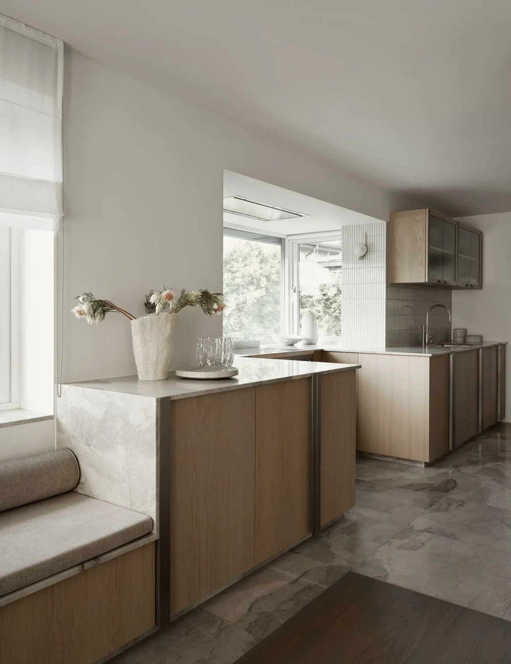 Den vakre sittebenken med innebygd oppbevaring fungerer som en forlengelse av kjøkkenet og binder de sosiale sonene sammen, samtidig som stedet inviterer til ro og avslapning med utsikt mot naturen utenfor.