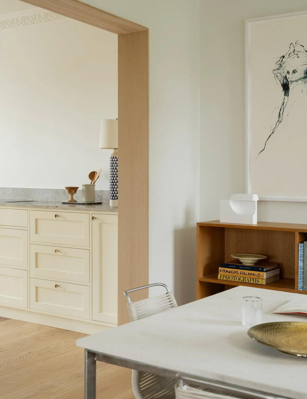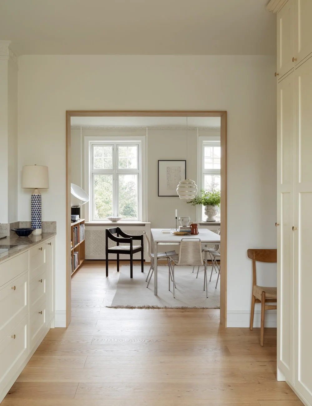 Mellom kjøkkenet og spisestuen er det en åpning som skaper et naturlig flyt mellom rommene. På veggen i spisestuen henger et kunstverk av den danske kunstneren Cathrine Raben Davidsen. Spisebordet er fra det danske merket Frama.