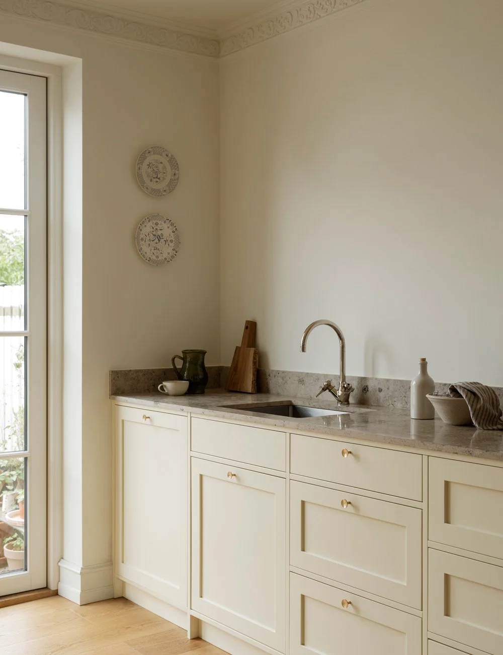 De myke gule tonene møter varmen fra kalksteinen og de diskrete messingdetaljene i perfekt harmoni. De vakre fatene på veggen har Line kjøpt vintage.