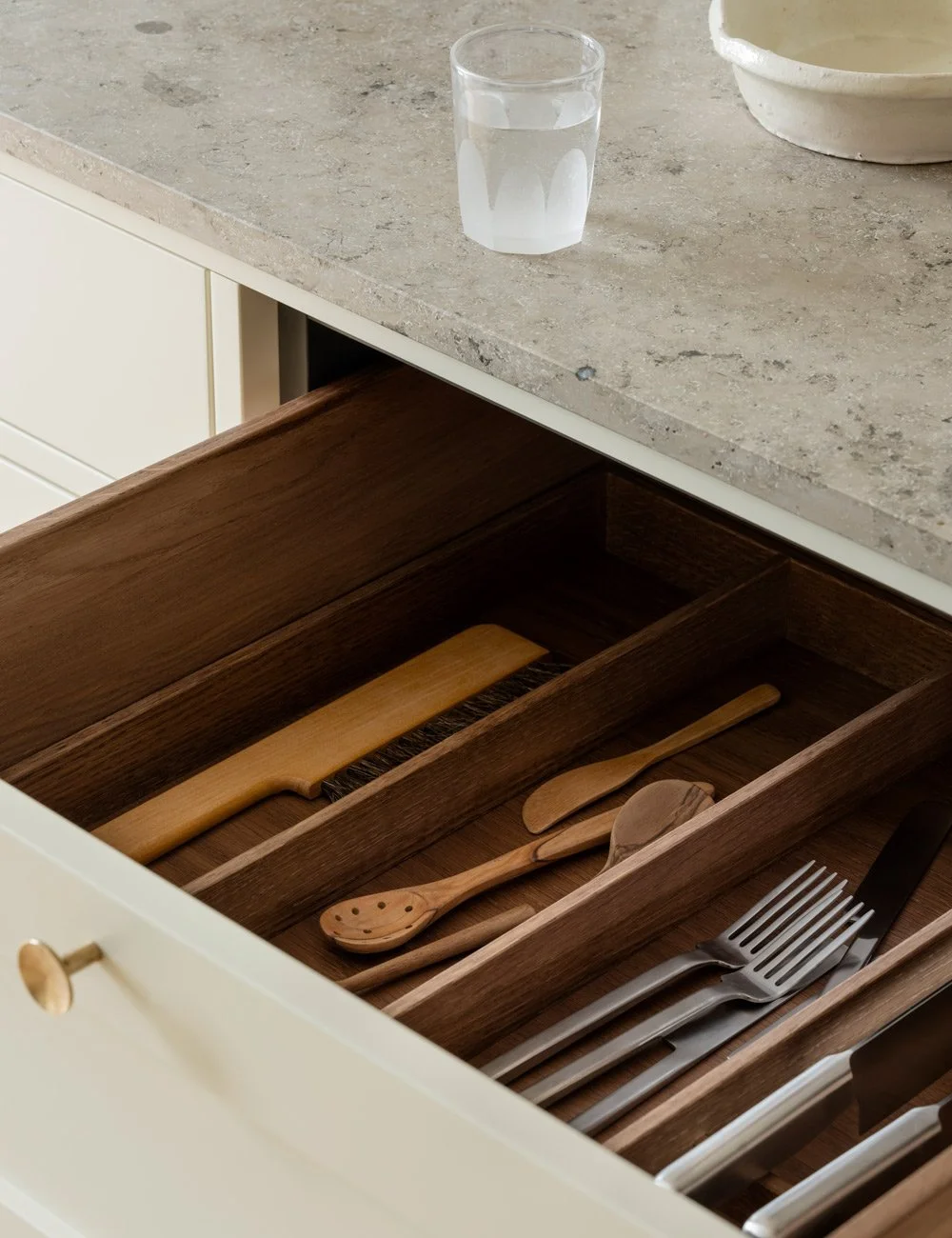 Med rikelig oppbevaring gjennom skuffer og skap holdes kjøkkenet ryddig og organisert.