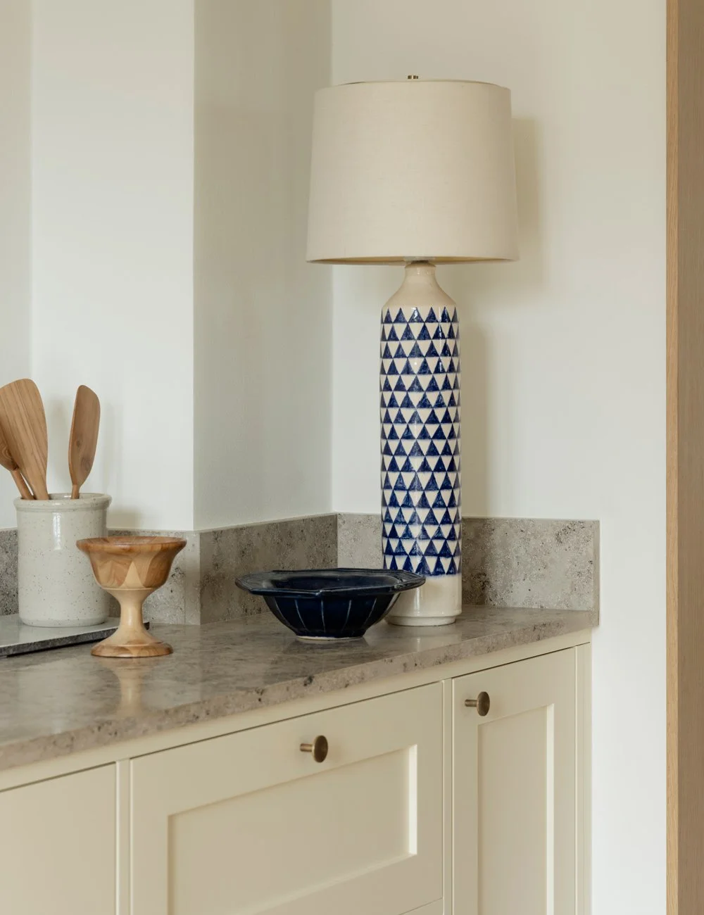Det lysegule kjøkkenet fra Nordiska Kök, designet for Line Kleins hjem i København, har et klassisk uttrykk med skap og fronter i shakerstil, kombinert med kremhvite vegger, tre og kalkstein som skaper en varm, lun atmosfære. På kjøkkenbenken står en håndmalt bordlampe skapt av den danske kunstneren Cathrine Raben Davidsen.