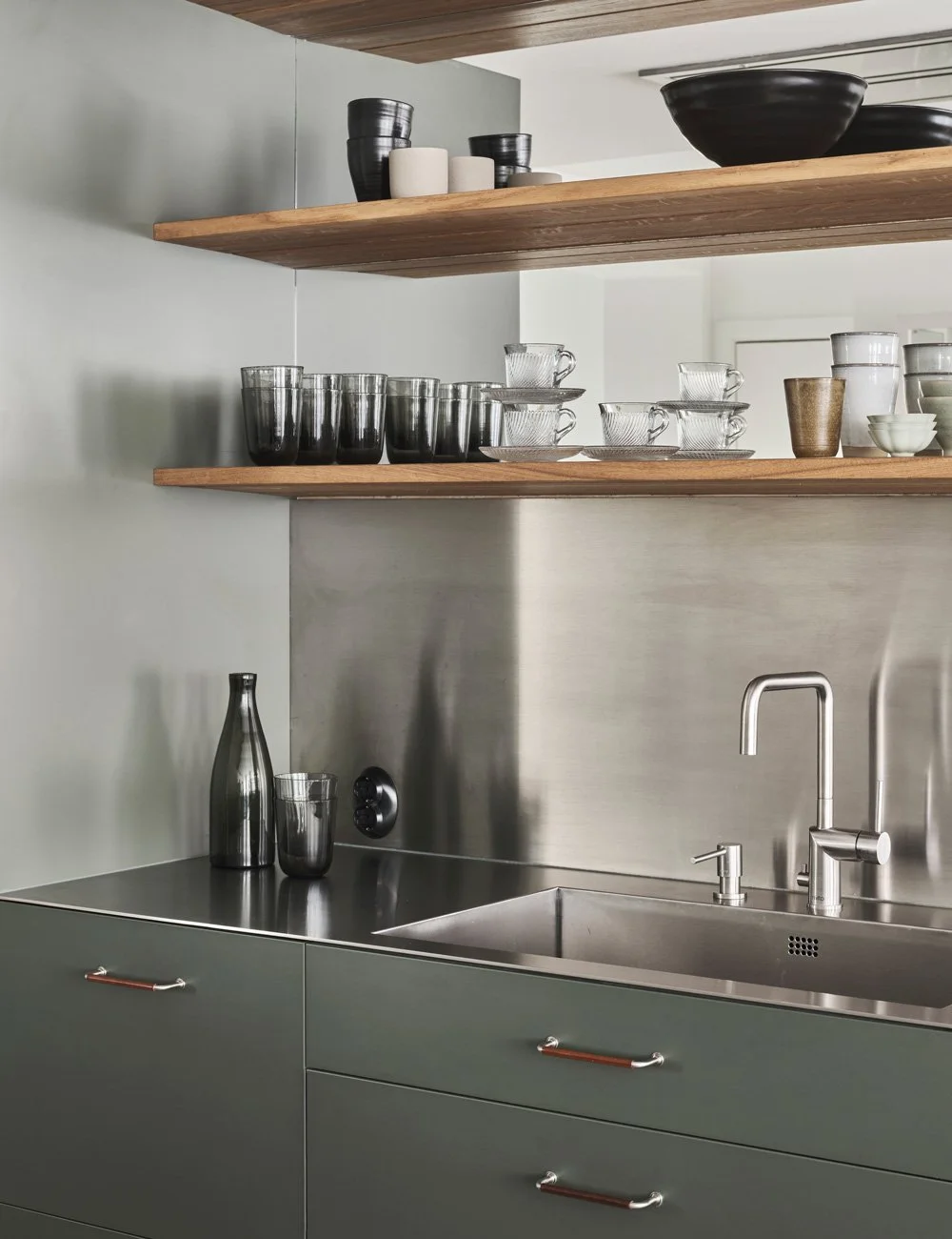 Åpne hyller i rustfritt stål blir en stilren og funksjonell detalj på kjøkkenet.