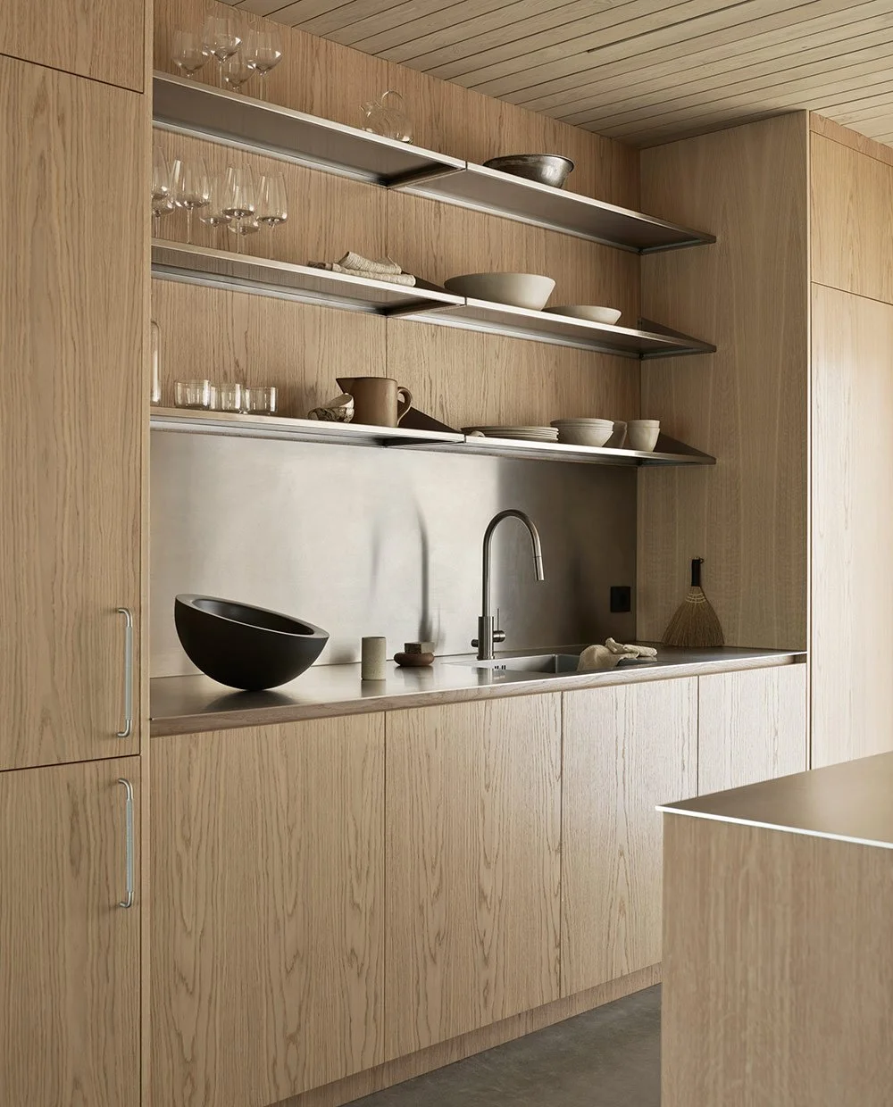 Svevende hyller og backsplash i rustfritt stål, balanseres vakkert opp av lys eik.