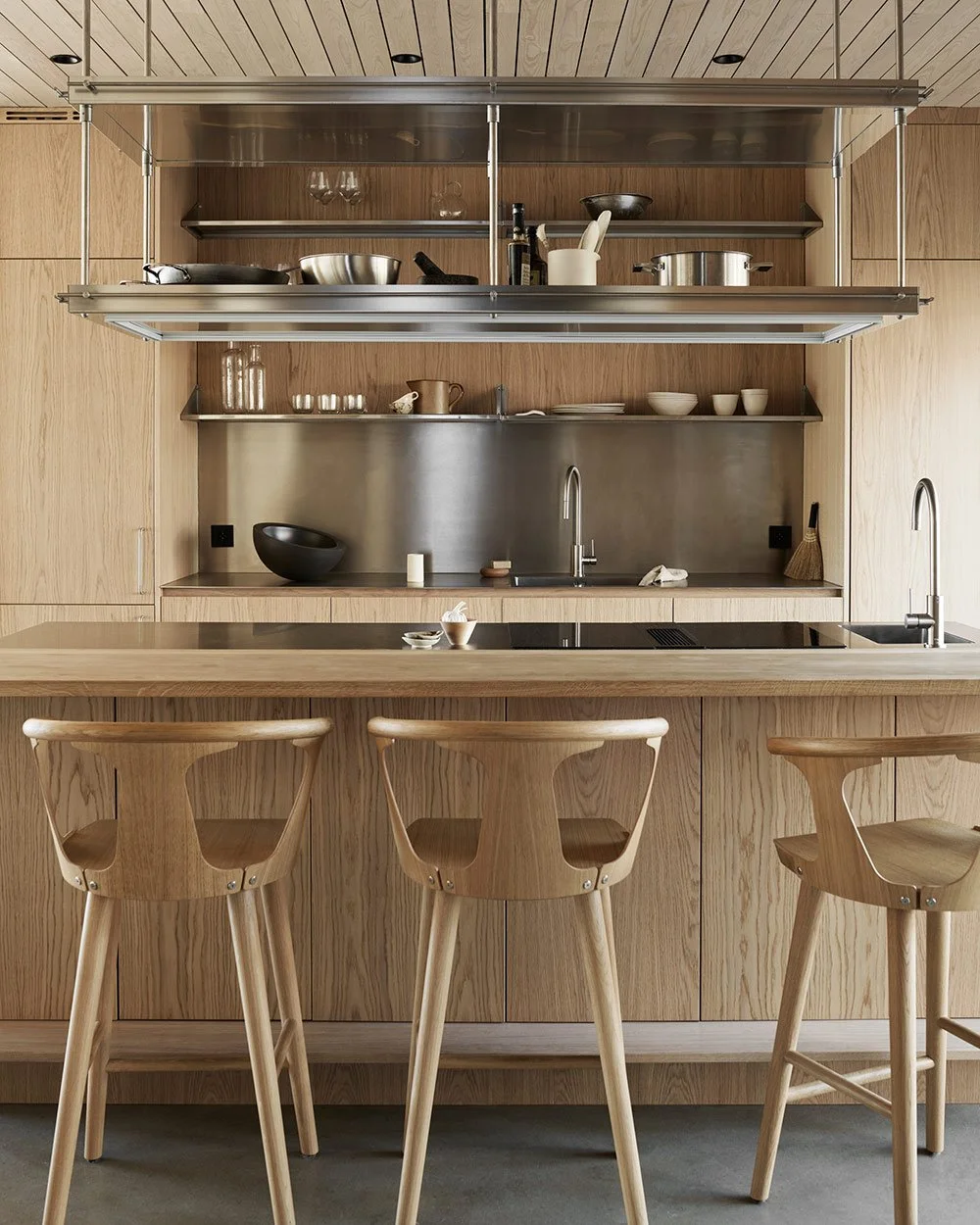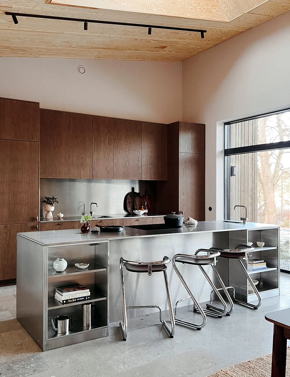 La deg inspirere av designerens trekjøkken med rustfri kjøkkenøy.