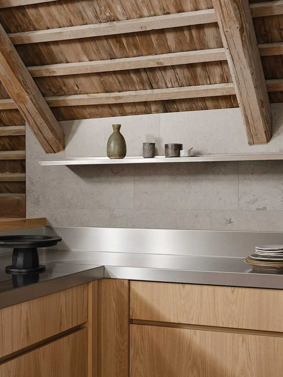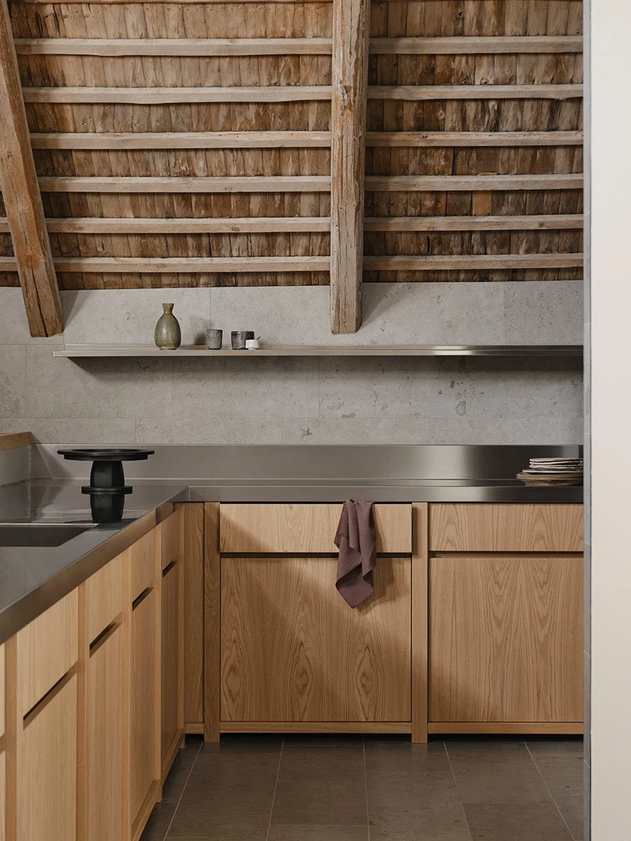 En tynn benkeplate i rustfritt stål møter en rustikk kjøkkenøy i varm eik – en perfekt balanse mellom rustikt og minimalistisk.