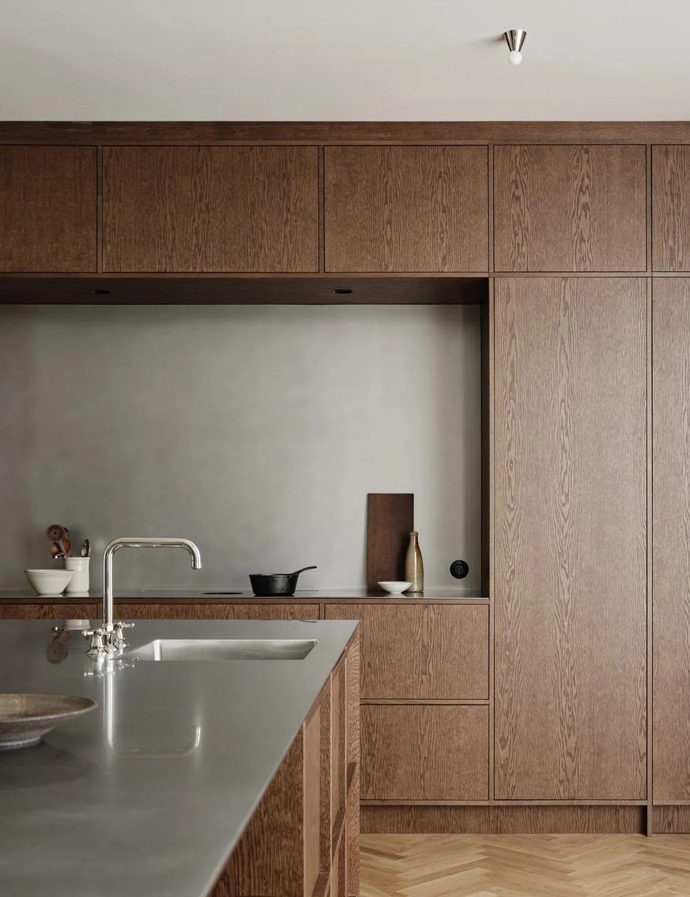 Benkeplaten i rustfritt stål tilfører en vakker kontrast mot skuffenes varme tretone – i det mørke trekjøkkenet i København.