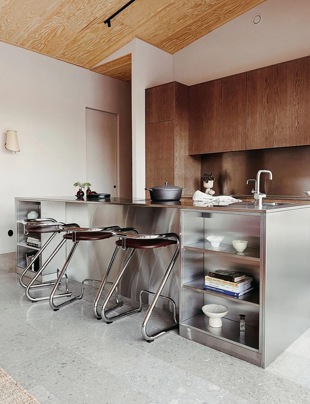 Den glatte overflaten på den rustfrie benkeplaten skaper en spennende kontrast mot varme tretoner.