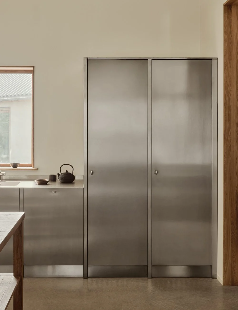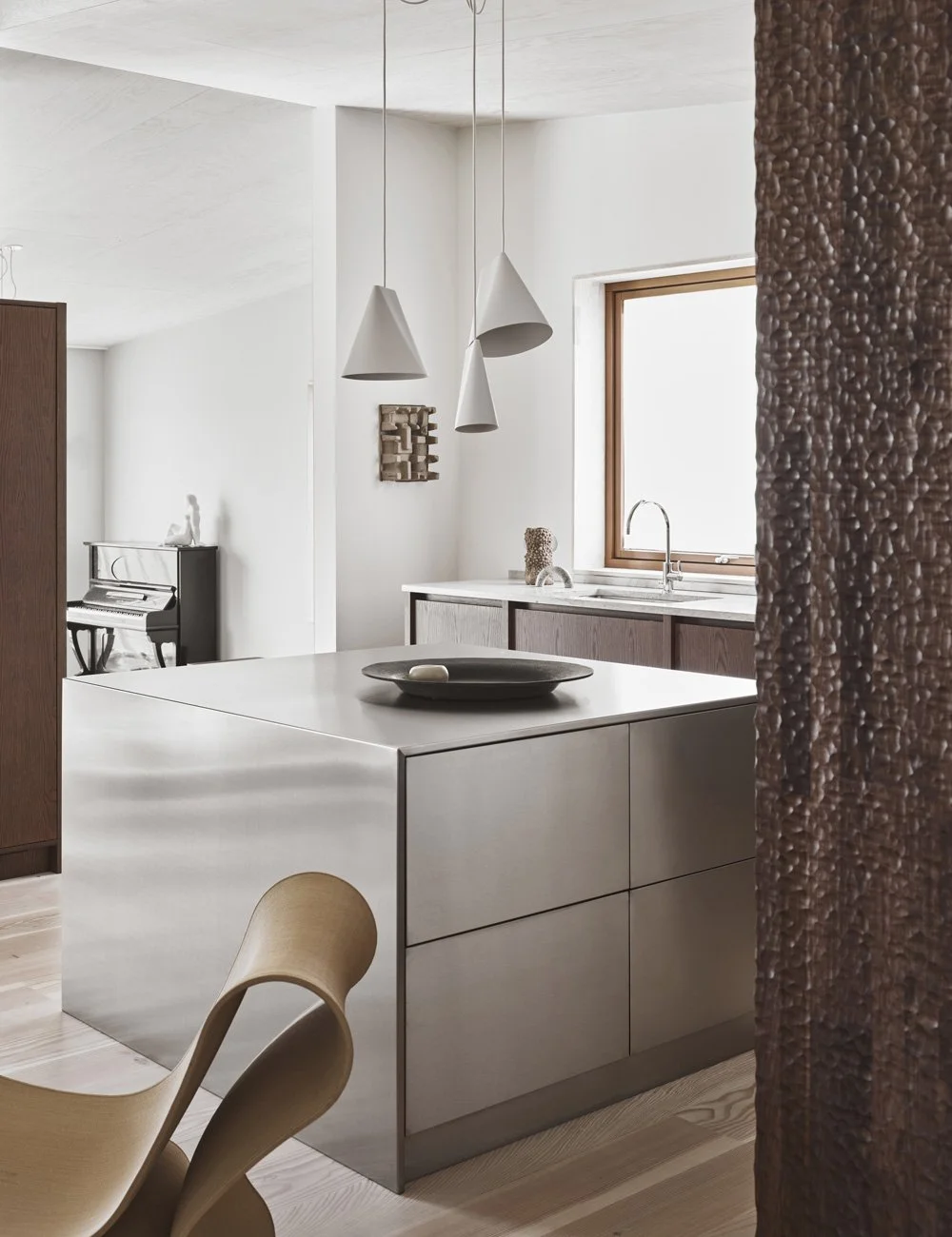 Rustfrie overflater reflekterer lyset, noe som skaper en åpen, luftig følelse, men også en spennende dynamikk i kontrast til andre materialer.
