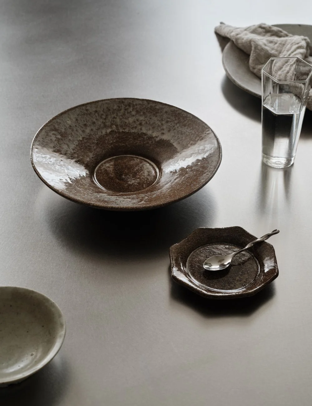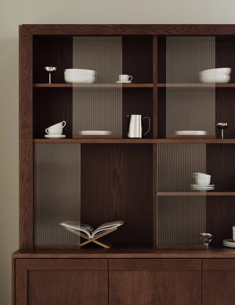 Å skape stilleben med detaljer i rustfritt stål er en enkel måte å skape en rød tråd i innredningen – som her i et vakkert vitrineskap i mørk eik, fra Nordiska Kök.