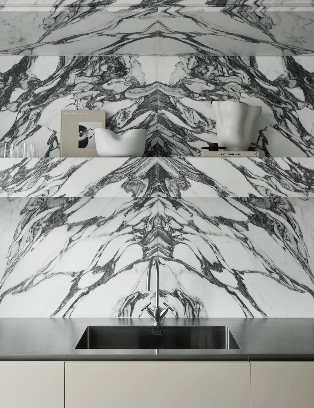 I The Statement Kitchen kontrasteres benkeplate i rustfritt stål med Arabescato Corchia marmor – et materialmøte som skaper en moderne, dristig vri med internasjonal eleganse.