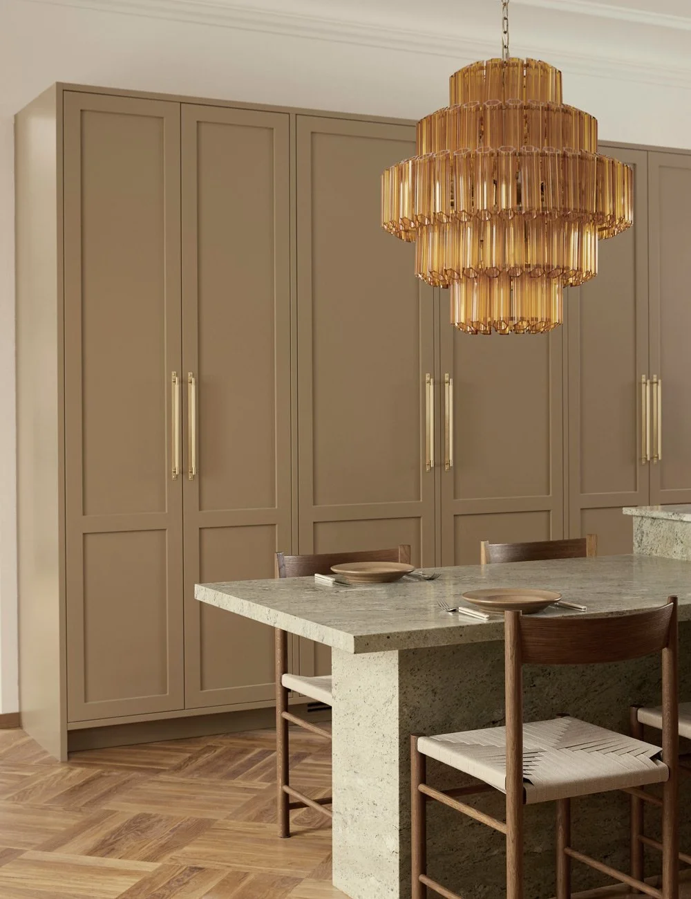 Med stilrene knotter, håndtak og kjøkkenkraner i messing tilføres en subtil, moderne kontrast til det klassiske kjøkkenet.
