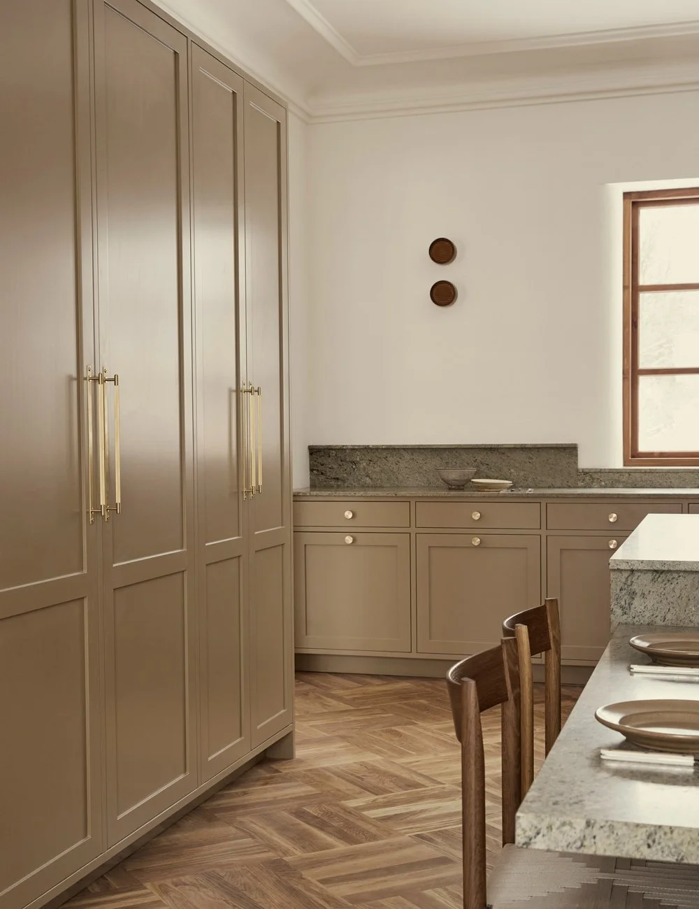 Med granitt og tre som hovedmaterialer, i kombinasjon med skap og fronter i klassisk shaker-stil, har dette kjøkkenet fått den rustikke karakteren som er kjennetegnende for landlige kjøkken og kjøkken i herregårdsstil. Et funksjonelt kjøkken med robuste naturmaterialer, utformet for virkelig å brukes, men også for å eldes vakkert over tid. Skapene og frontene i Shaker-stil er malt i Nordiska Köks egen farge Desert Clay, en varm og dempet jordnær nyanse som tilfører rommet varme og ro.