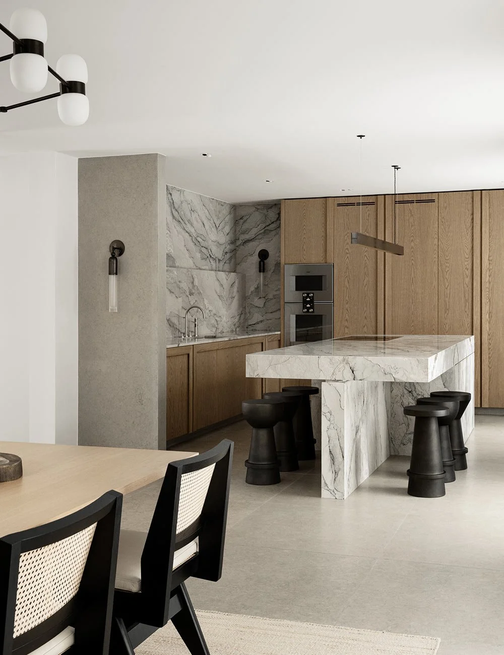 Eikens kjølige tone føles både eksklusiv og tidløs, og på kjøkkenet er den matchet med dramatisk stein som går langs den ene veggen. På motsatt side av kjøkkenet er en vegg helt kledd i tre, samt en spesialdesignet benk og oppbevaring som passer inn i kjøkkenets design og skaper en vakker sammenheng med resten av interiøret.