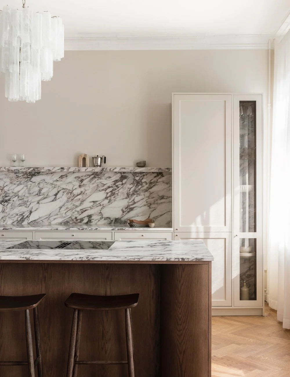 Resultatet ble et måltilpasset, moderne shakerkjøkken i lys beige og en stor kjøkkenøy i varm eik, fra Nordiska Kök. Vakkert innrammet av leilighetens tidstypiske detaljer som høyt under taket, stukkatur og originale lister – en perfekt balanse mellom fortid og nåtid.