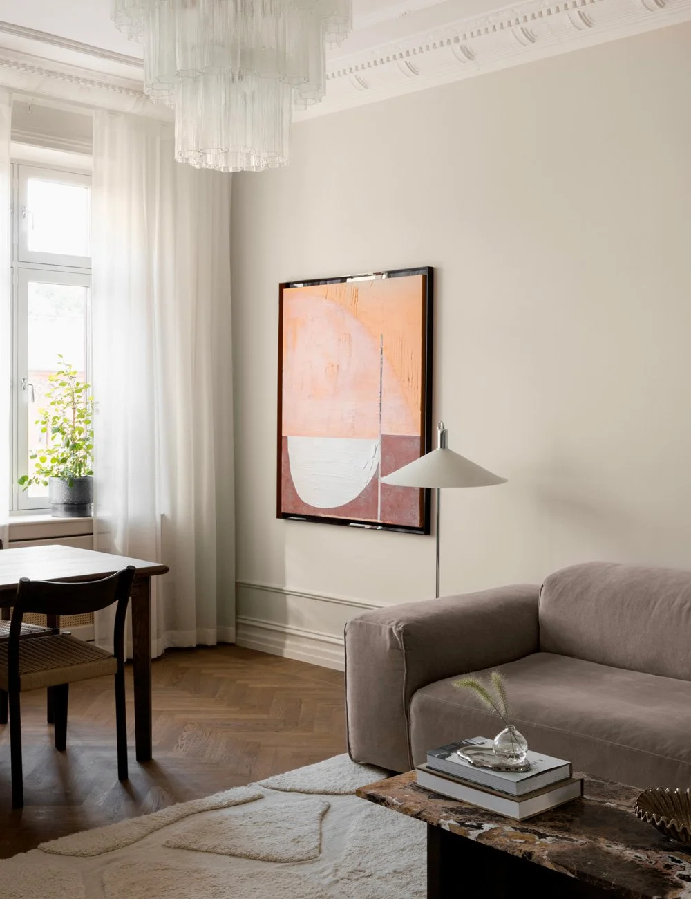 I parets hender har leiligheten fått nytt liv. De over hundre år gamle listene og takrosettene var lenge skjult under tykke lag med maling, som hadde visket ut de fine detaljene. Med varsom hånd har Marina og Timmy skrapt frem og restaurert dem, slik at den opprinnelige detaljrikdommen igjen kommer til syne. Veggene ble malt i en myk, lys beige tone, mens vinduer, dører og lister fikk en litt mørkere beige nyanse – en elegant kontrast som fremhever de klassiske formene.
