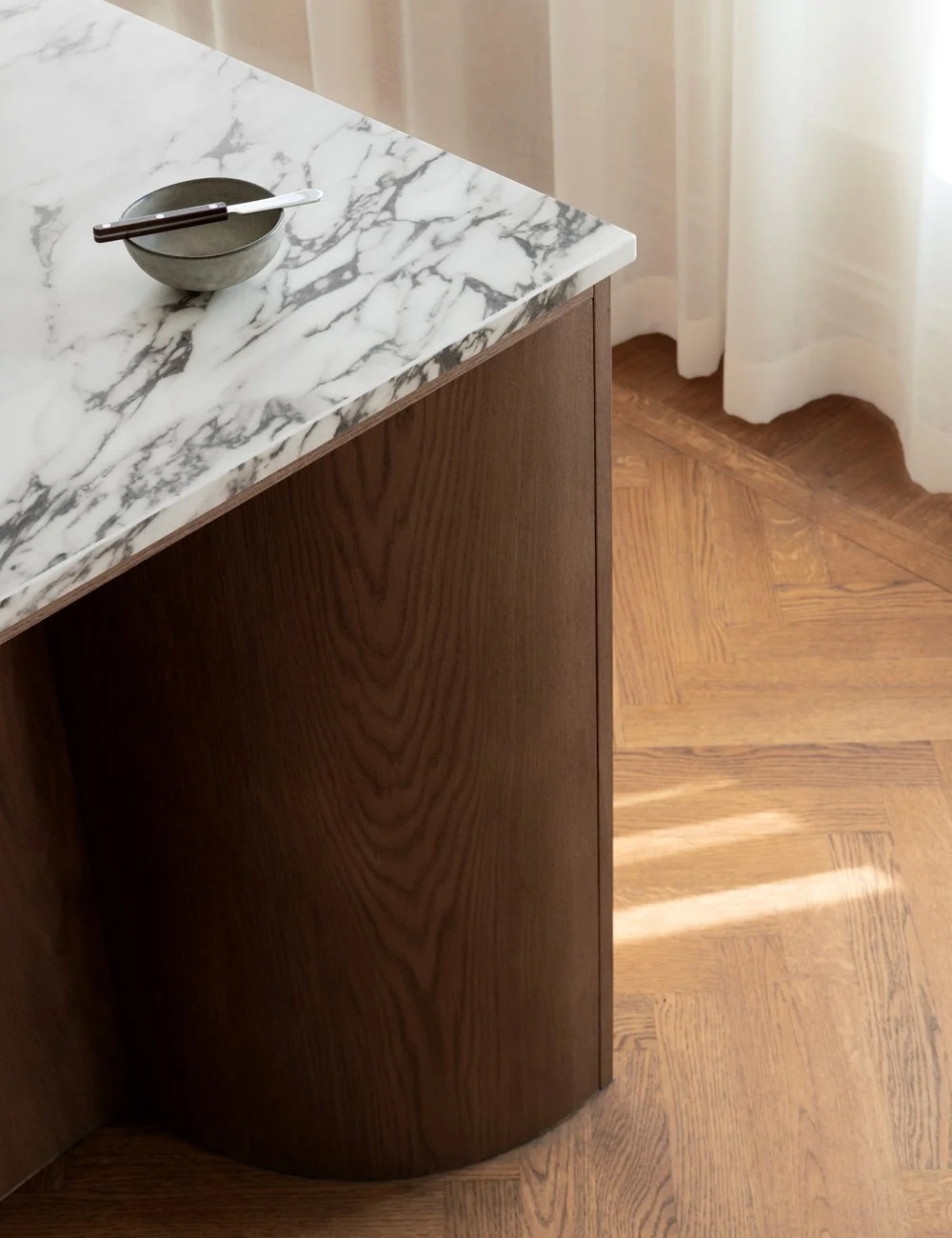 Kjøkkenøya i mørk eik med avrundede hjørner er kjøkkenets naturlige midtpunkt – en ekte centerpiece som inviterer til både matlaging og samvær.