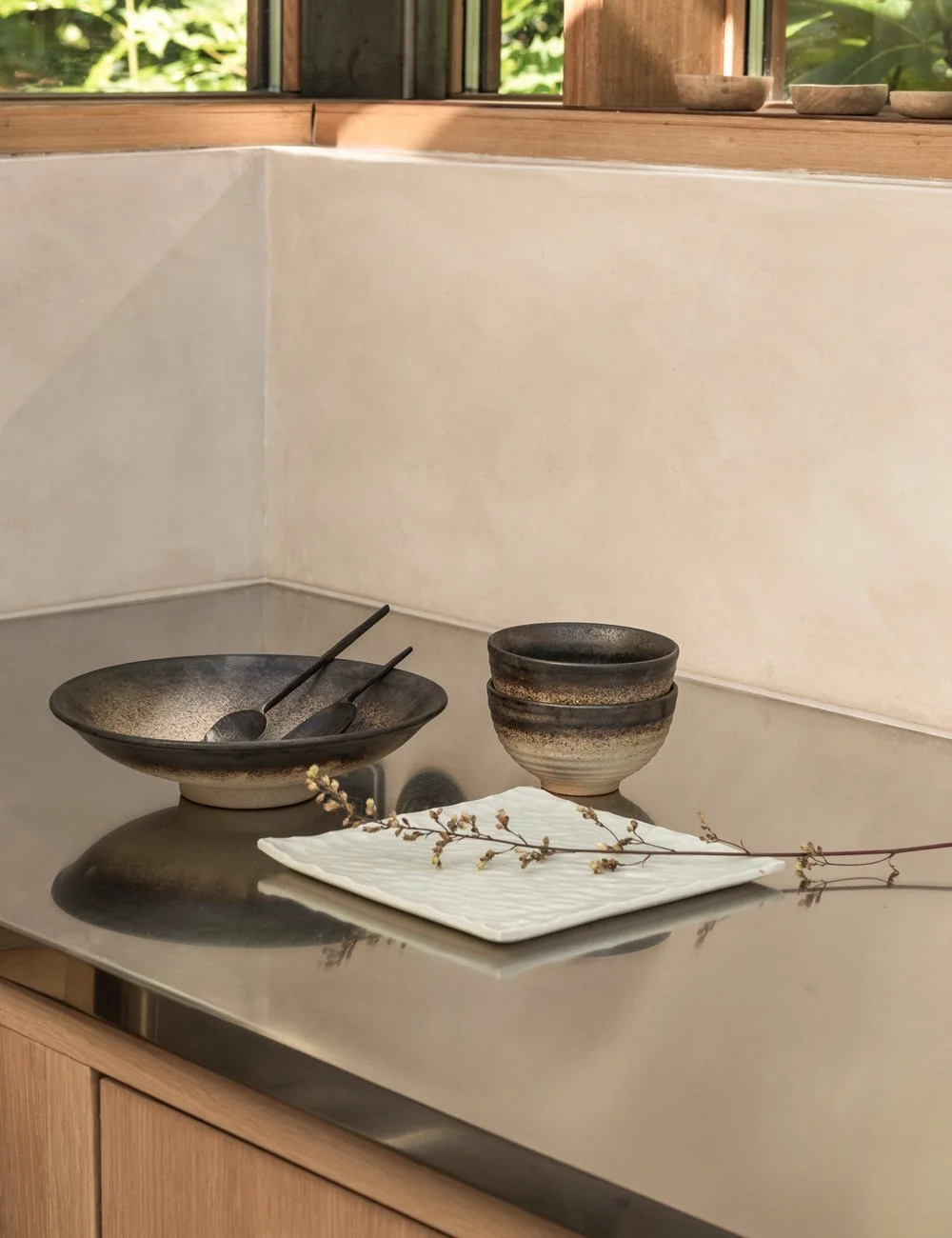 I orangeriet er materialene taktile og nøye utvalgt – fra matte, pussede vegger til blanke benkeplater i rustfritt stål. Skåler og brett fra Japan og Vietnam. Antikk morter fra Frankrike.