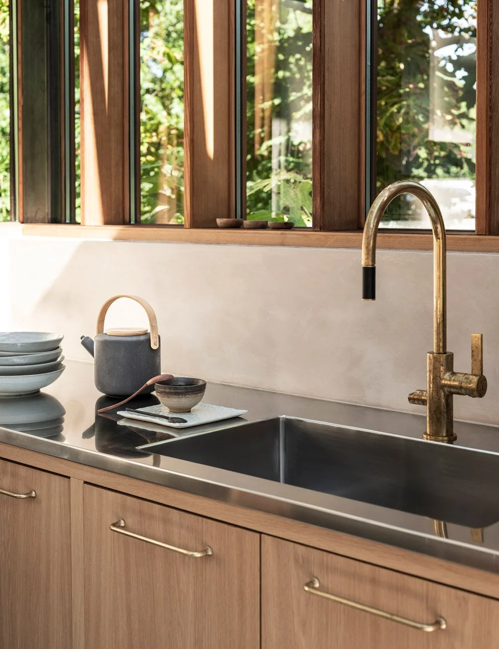 Skandinavisk design spiller sammen med japansk estetikk i det lille, men velplanlagte kjøkkenet. Vegger i tadelakt. Benkeplate i rustfritt stål fra Decosteel.