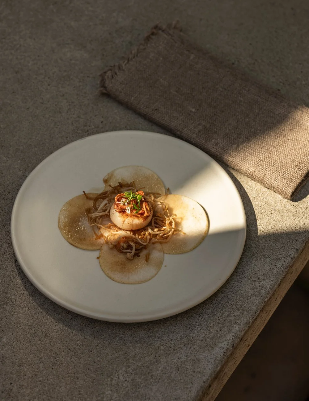 Grillet kamskjell med yuzusoja-saus og nashipære – en av rettene som serveres i Ett Orangeri. Tallerken fra Japan.