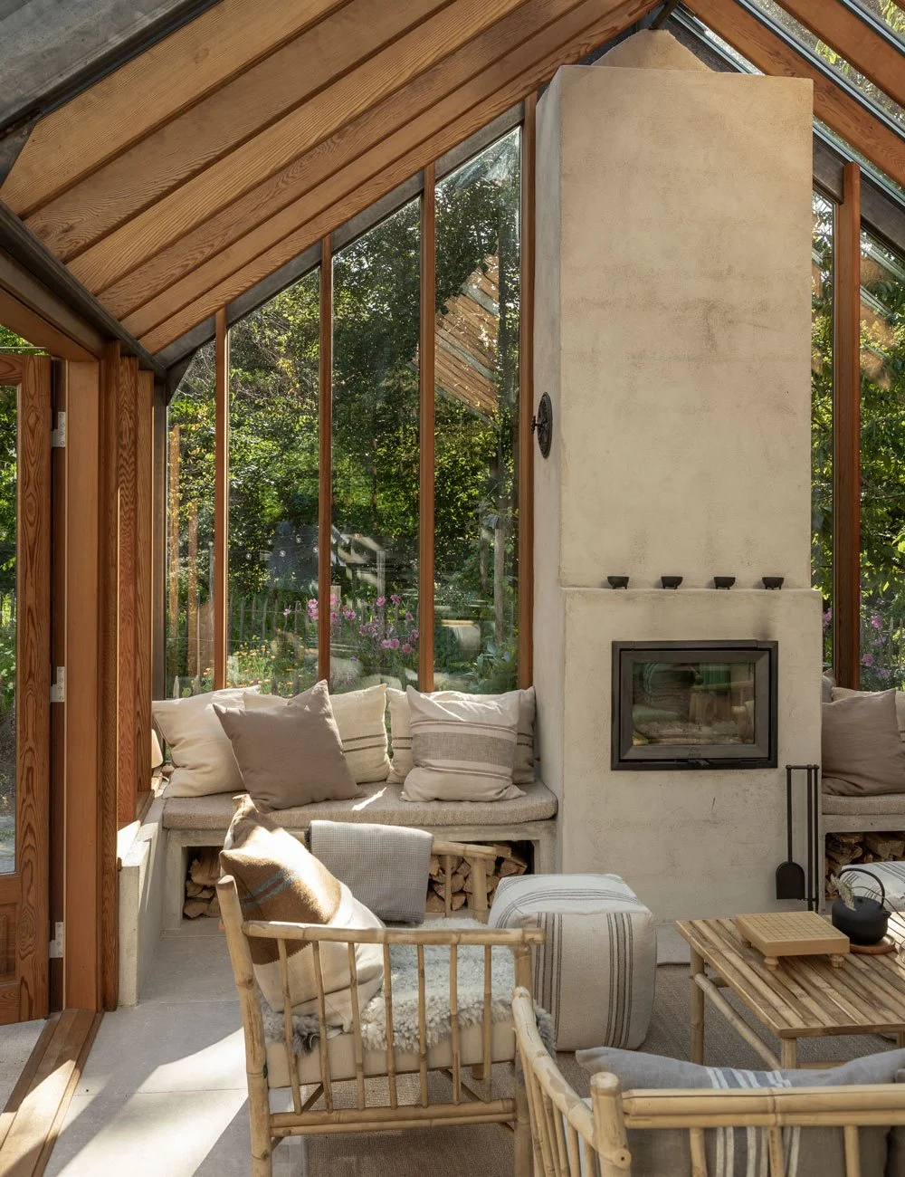 En loungeplass ved peisen, med kjøkkenhagen rett utenfor, inviterer til ro og avslapning.