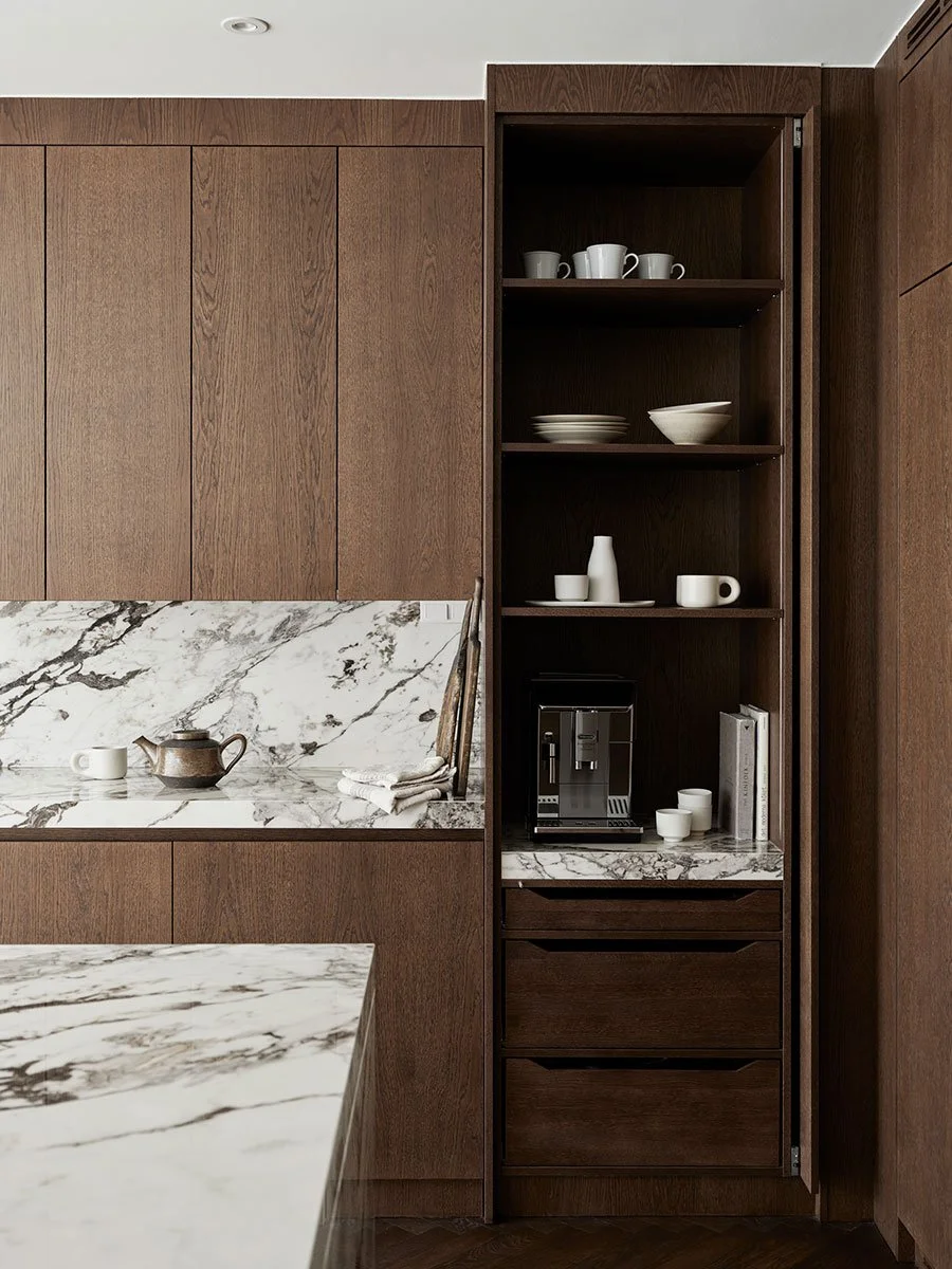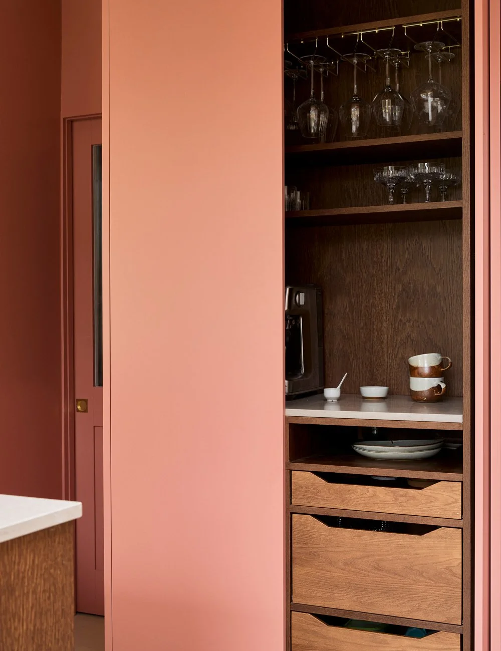 Lag en skjult kaffestasjon og oppbevar kopper og tilbehør bak pocket door-skapet for et rent og stilrent uttrykk.