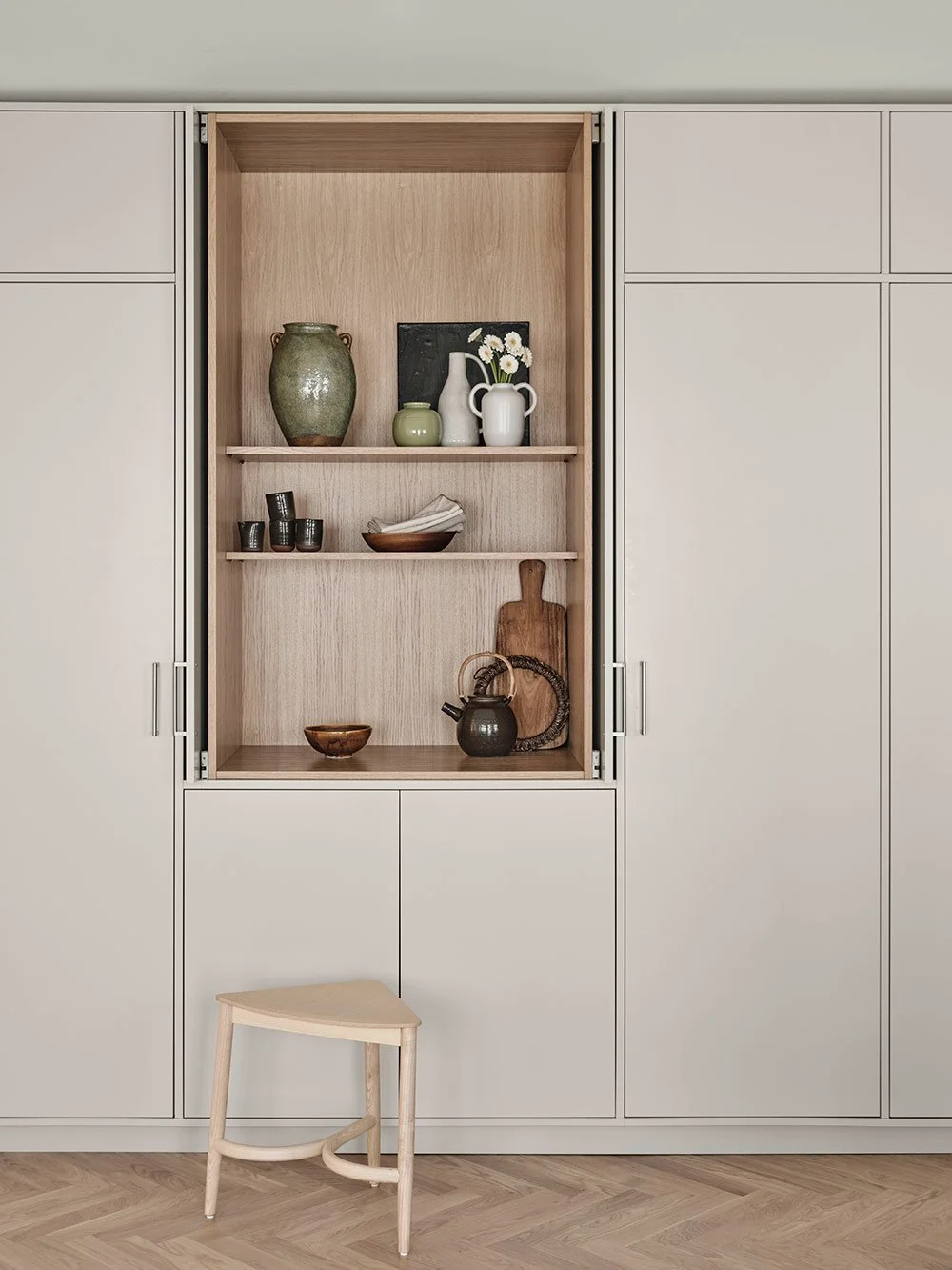 Skap med pocket doors som enkelt glir inn og gjemmes i rom ved siden av skapet, har blitt et populært valg på kjøkkenet. Du velger selv om du vil ha dørene åpne eller lukket – for å skjule alt og skape et roligere inntrykk – når det er tid for sosialt samvær. En smart løsning som gir både funksjonalitet og harmoni på kjøkkenet.