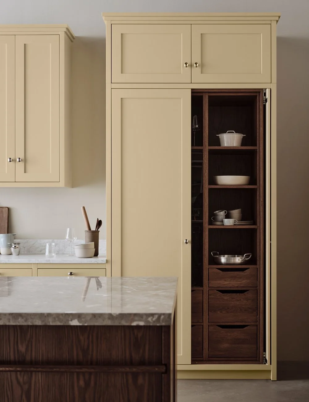 Skap vakker kontrast med innside i mørk eik. Se mer fra det gule landkjøkkenet.