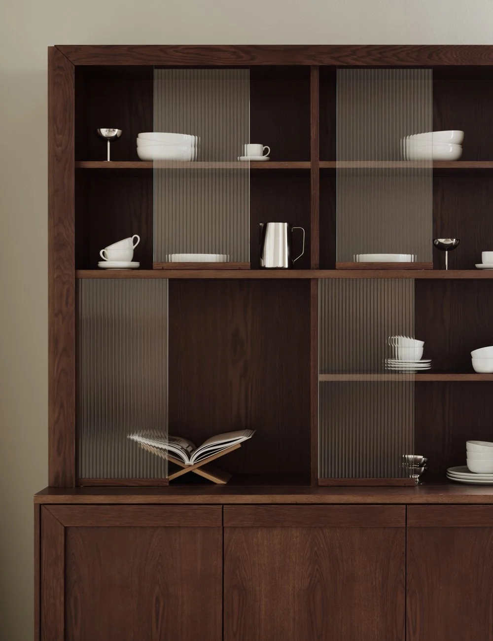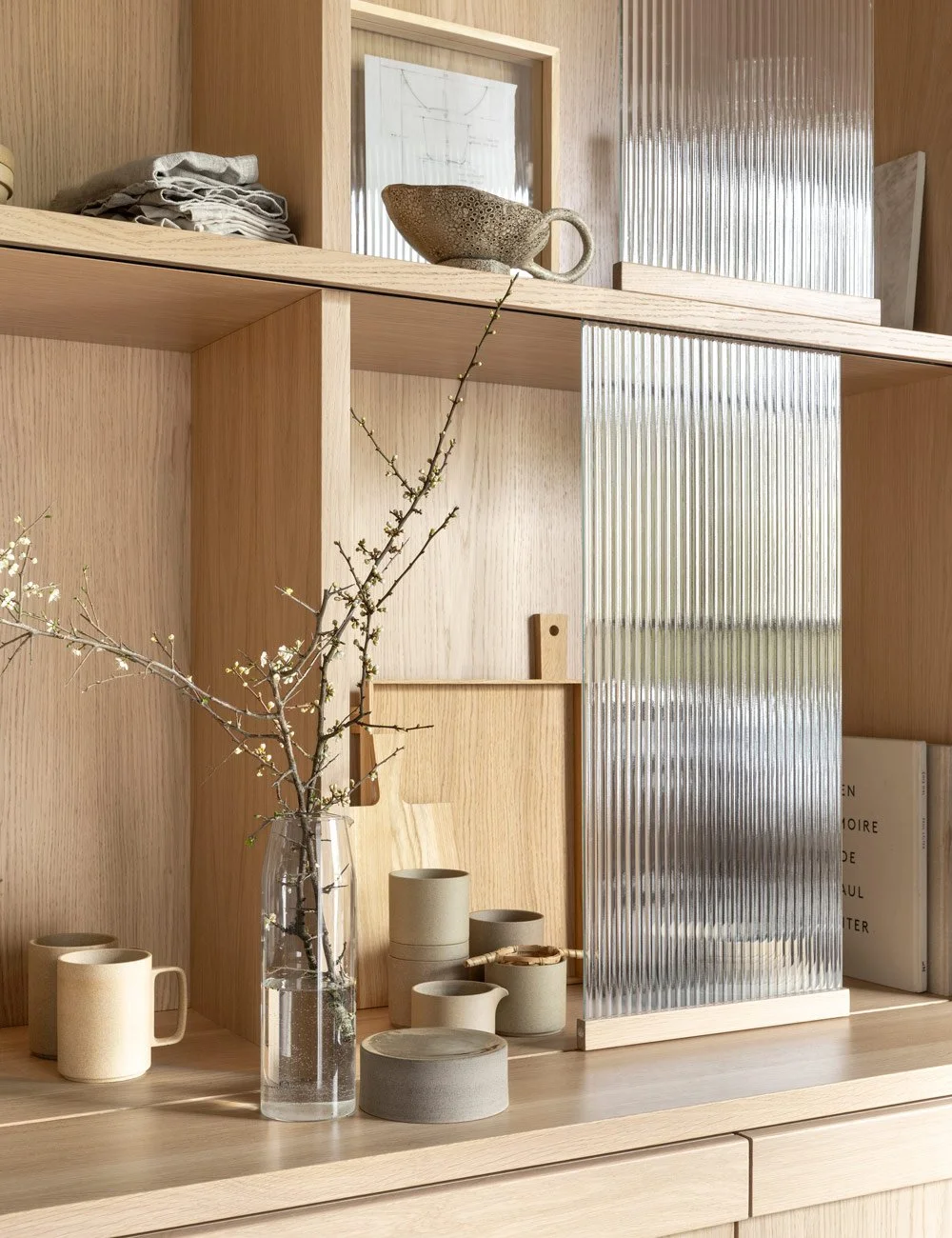 Vitrineskap med rillet glass og innside i lys eik. Det rillete glasset gir et sofistikert og elegant uttrykk, og skjuler delvis innholdet i skapet.