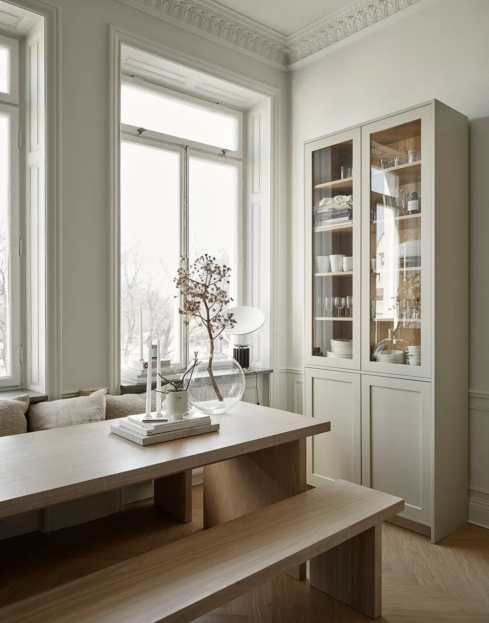 Det innebygde hvite vitrineskapet med rillet linjeglass er en vakker og stilfull oppbevaringsløsning som dessuten gir en åpen og luftig følelse til rommet.