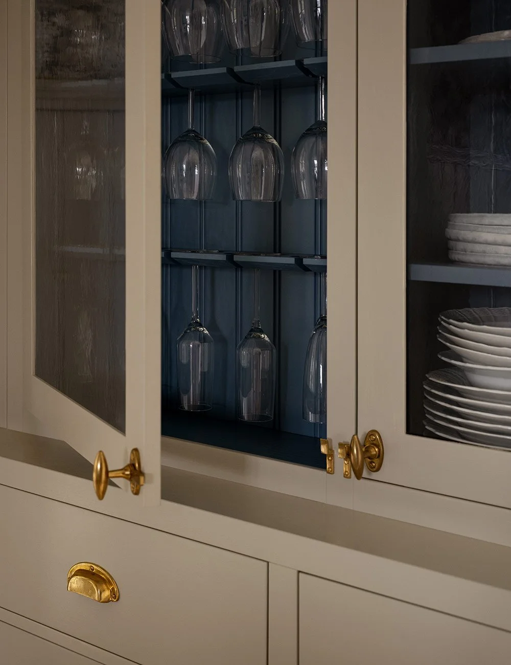 Beige vitrineskap med blå innside og klassiske messinghåndtak.