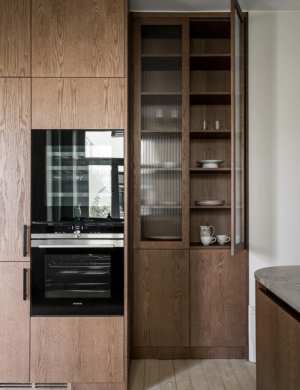 I det mørke eikkjøkkenet utnyttes oppbevaringsmulighetene maksimalt, med et innebygd vitrineskap med rillet linjeglass som går helt opp til taket.
