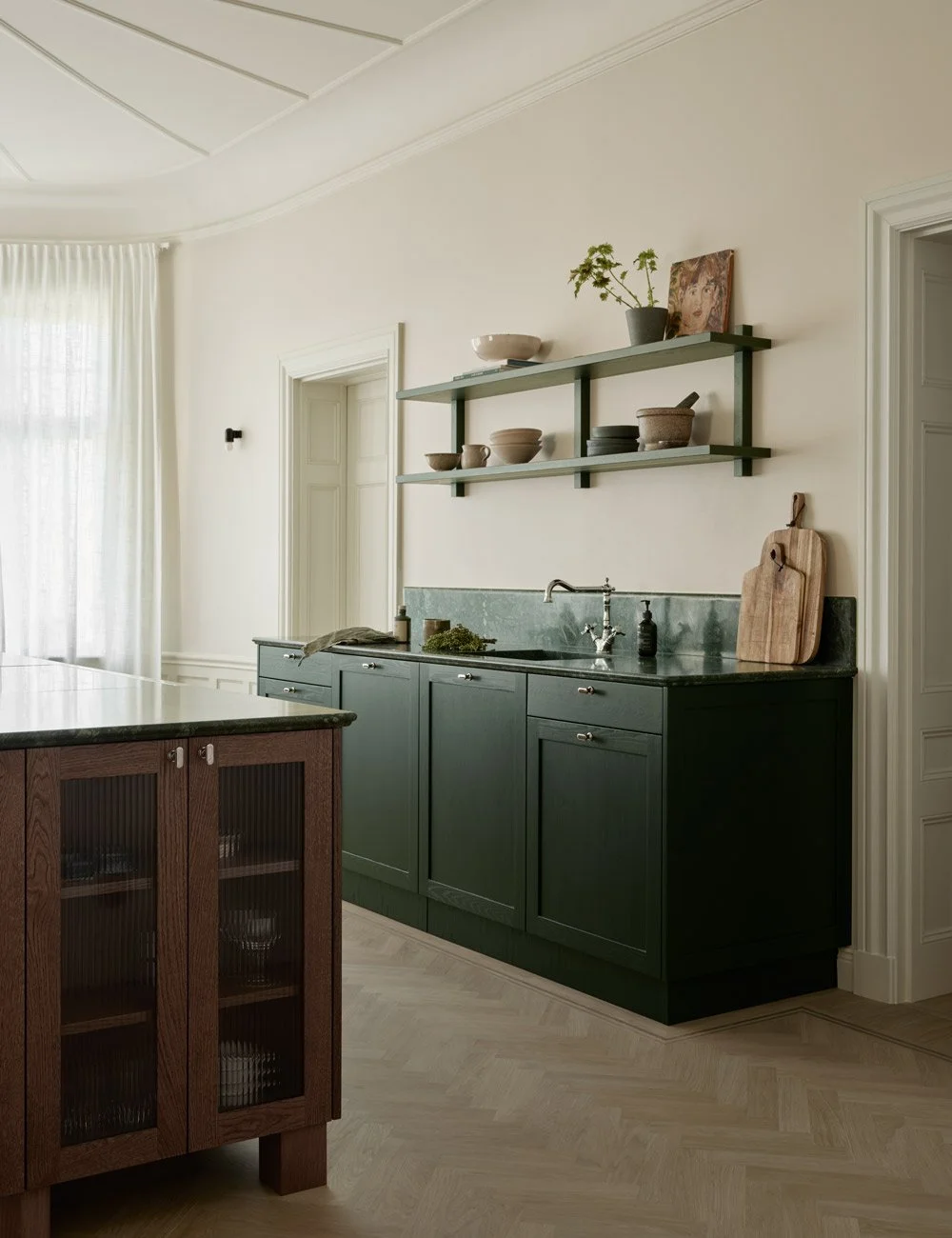 Vitrineskap med dører i rillet glass kombinert med grønne underskap gir et personlig uttrykk – les mer om hvordan du kan kombinere stiler for å skape et unikt kjøkken.