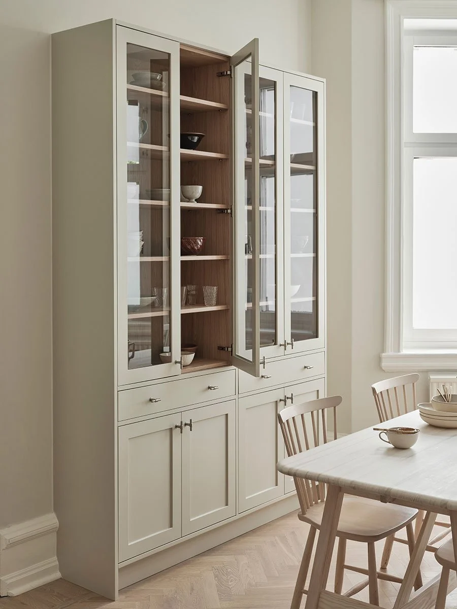 Det innebygde vitrineskapet er ofte en integrert del av kjøkkenet og utformes for å gli sømløst inn i helheten – både når det gjelder proporsjoner, materialer og uttrykk. Det tilbyr smart og stilfull oppbevaring av for eksempel glass, tallerkener og serveringsboller – eller andre ting du ønsker å ha lett tilgjengelig på kjøkkenet.