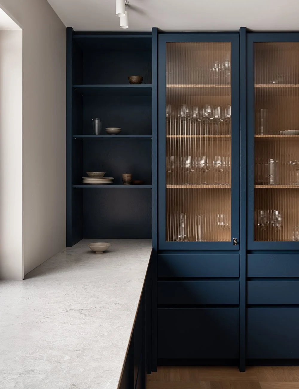 Innebygd blått vitrineskap med rillet glass og innside i lys eik, i arkitektens retrokjøkken.